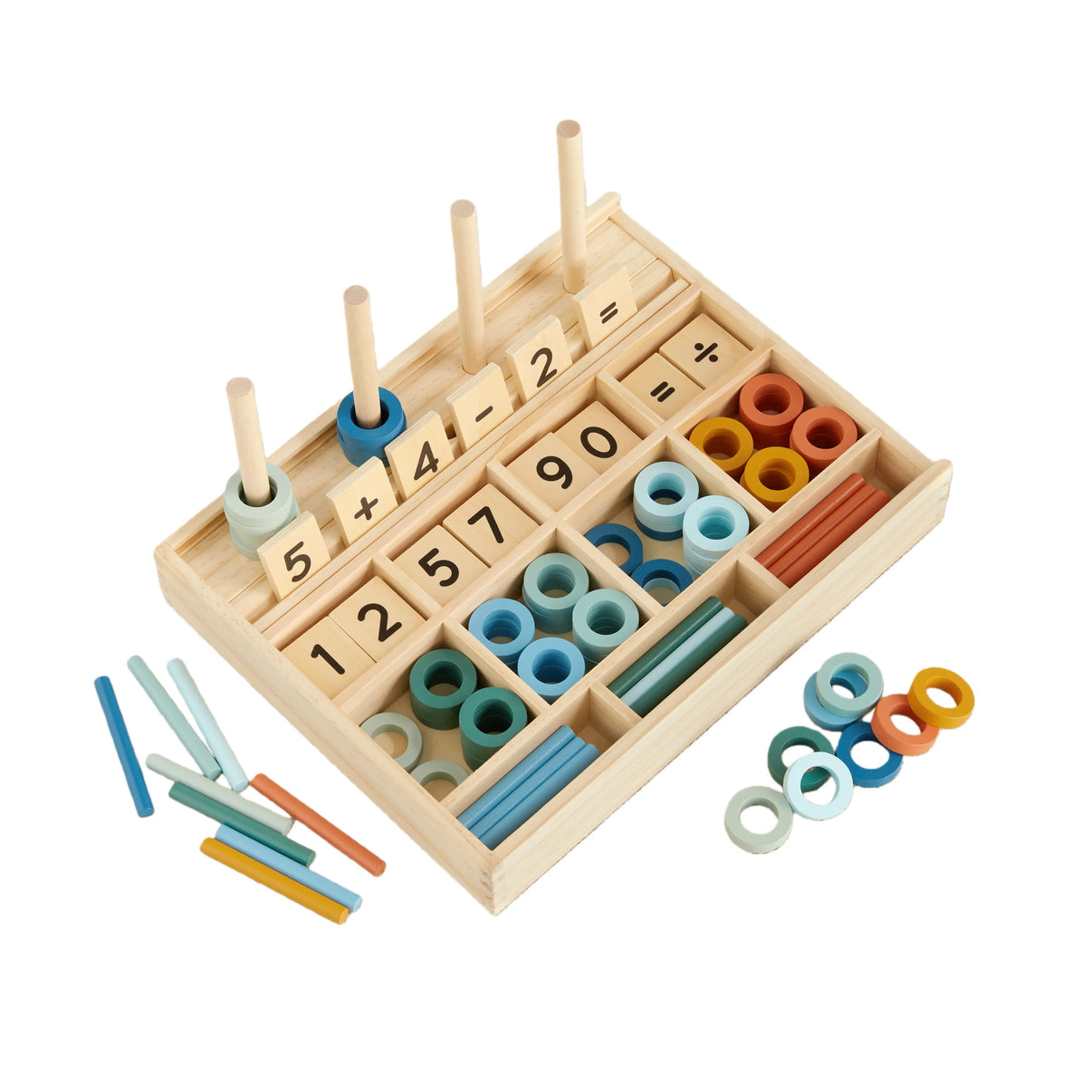• All-in-one math station: 43 number & symbol tiles, 44 counting sticks, 64 counting rings, equation tray & pegs for hands-on learning.