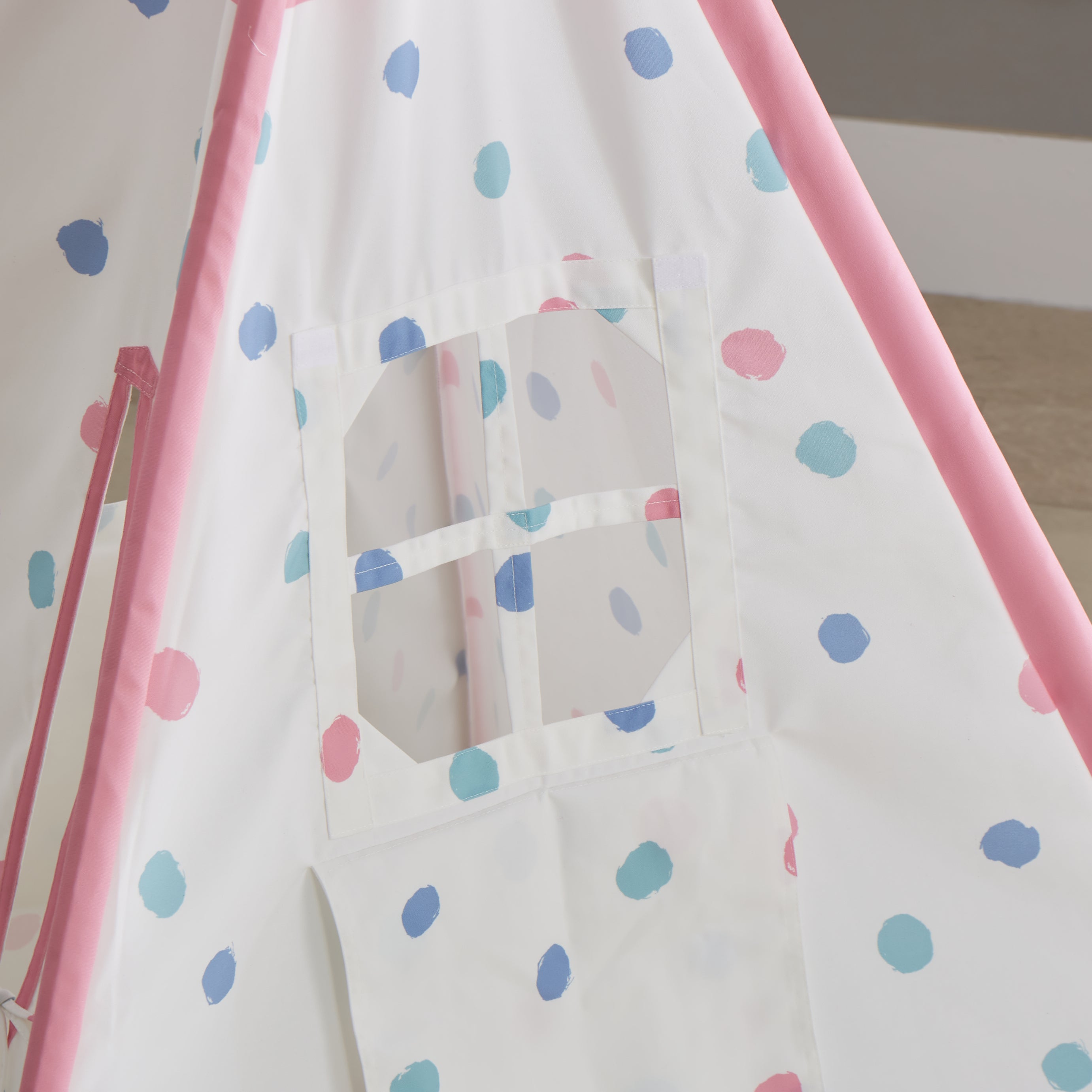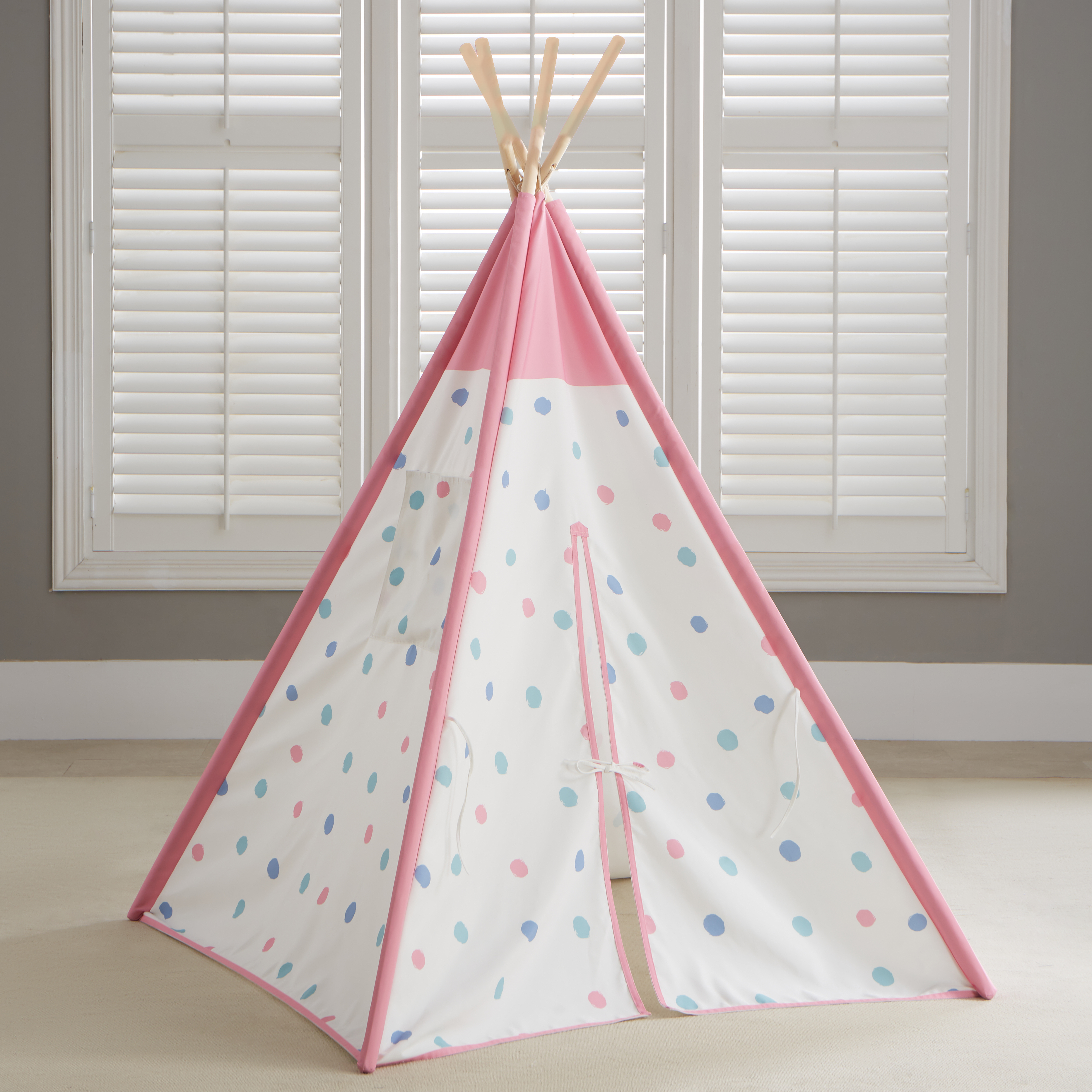 Asweet teepee with color dots, indoor play tent for babies. Made of eco-friendly fabric, rpet material. It is also a UV resistant, flame retardent, UV resistant, waterproof fabric.