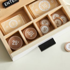 Asweets Cash Register, This cash register comes with 15 wooden printed coins, 9 wooden printed bills, a wooden printed credit card, and an attached scanner.