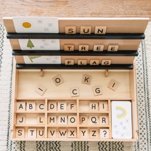 Asweets Compelling Spelling, for 3+ babies. Made of plywood, beech and cardboard. It includes 64 wooden letter tiles and 30 beautifully illustrated spelling cards.