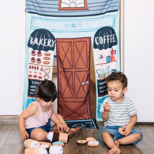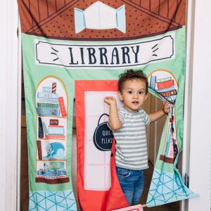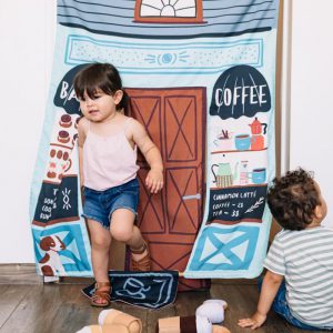 Asweets Reversible Coffee Shop&Library Doorway Playhome for 3+babies, Made of poly canvas with fiberglass pole. Colorful canvas hangs easily in any doorway with the fiberglass pole and loops.