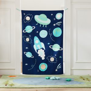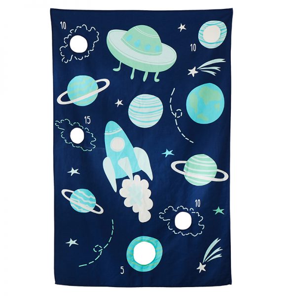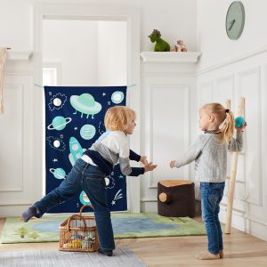Asweets Space Doorway Bean Bag Toss for 3+ babies, Made of cotton canvas, It can easily hang in any doorway for space saving fun. It includes 6 star- shaped tossers.