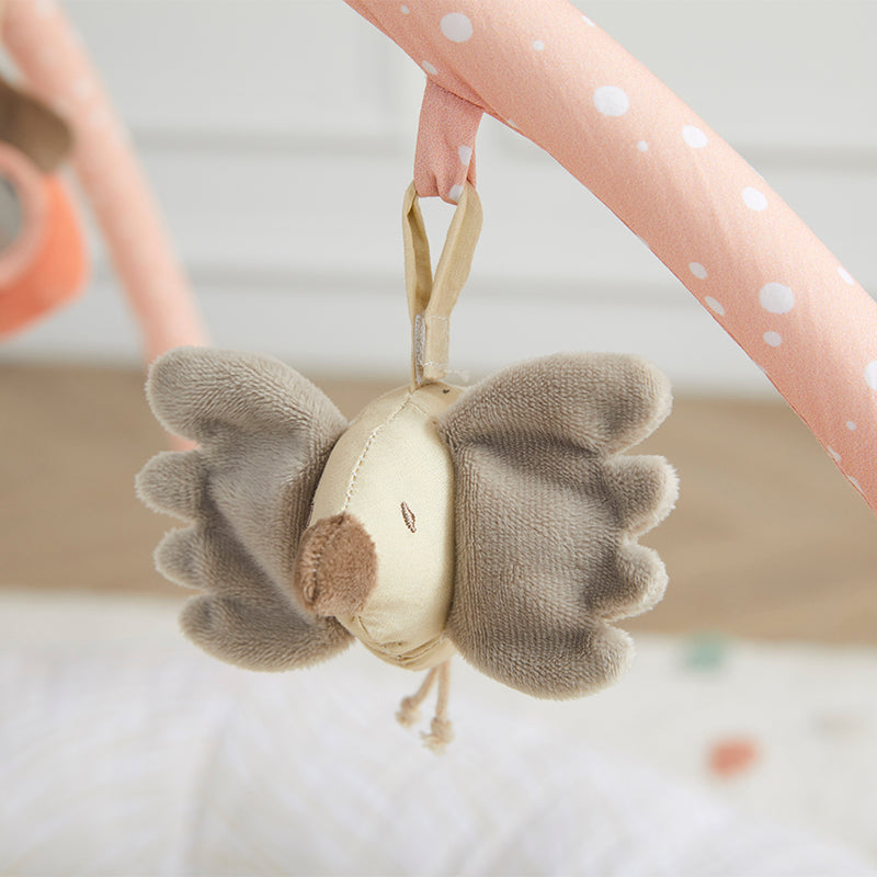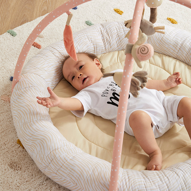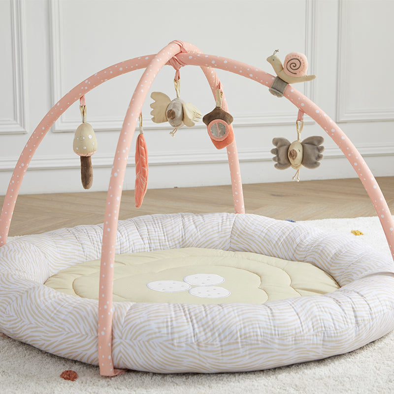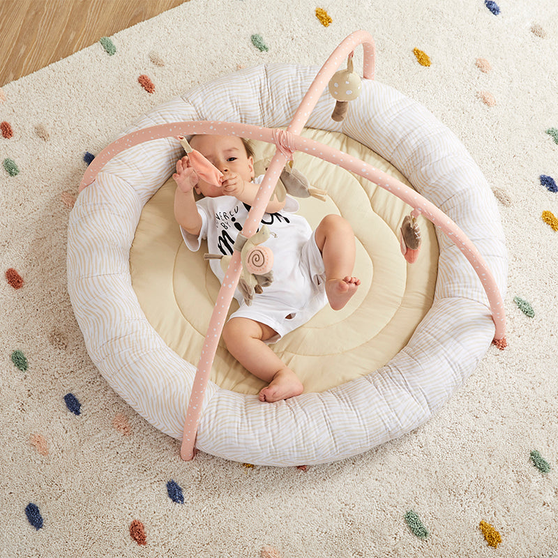 Baby will never want to leave the nest when they play on our Nest Baby Activity Gym. Soft, cushiony mat has a super soft outer poly filled ring to help keep them in place. When baby is on her back, she can reach for the sweet rattles, which are removable and perfect for travel. Or remove the activity bar so baby can take a nap. For use on the floor only. Never leave baby unattended.